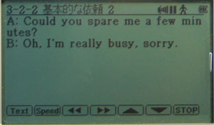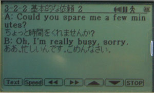 自動対話機能。2人の会話形式の例文の場合、Aさんの文は機械でネイティヴが話し、Bさんは自分でしゃべるという練習ができます。